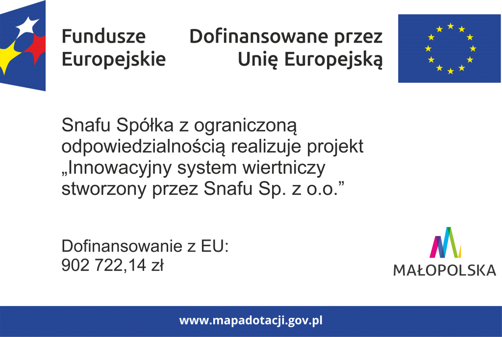 Spółka SNAFU sp. z o.o. otrzymała dofinansowanie z Funduszy Europejskich na realizację projektu „Innowacyjny system wiertniczy”. Celem przedsięwzięcia jest opracowanie i wdrożenie nowoczesnej technologii do wierceń geotechnicznych, poprawiającej jakość badań gruntu i efektywność pracy.